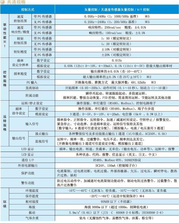 *4:矢量控制中,無(wú)PG傳感器時(shí)為0.25Hz~240Hz/PG傳感器的為0.05Hz~240Hz(極數不同,范圍不同)